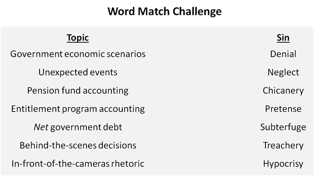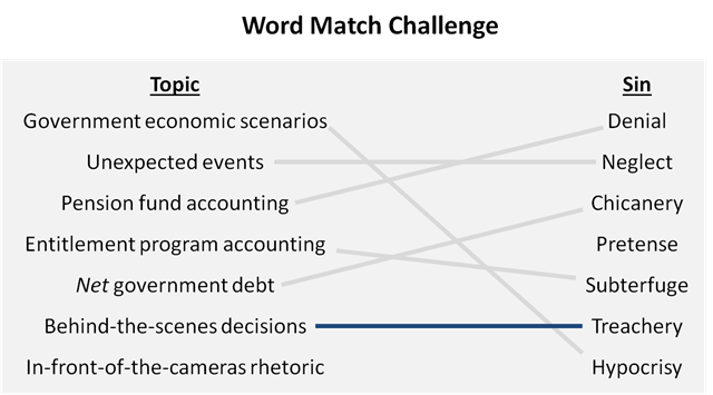 This is my sixth word association in a series of articles called “Seven Deadly Sins of the Government Debt Debate.” I’ve been cataloging the many ways that government budget projections mask the true severity of our debt problem. And I’ve added the competitive element of a word match. Well okay, there’s not much competition involved, but have a look at the diagram below and see if you can match the seven “sins” on the right to the seven topics on the left. In this article, I’ll suggest a match for topic #6: “Behind-the-scenes decisions.” It’s not necessary to see my first five matches to follow this one, but here’s a one sentence summary of each to give you the general idea: