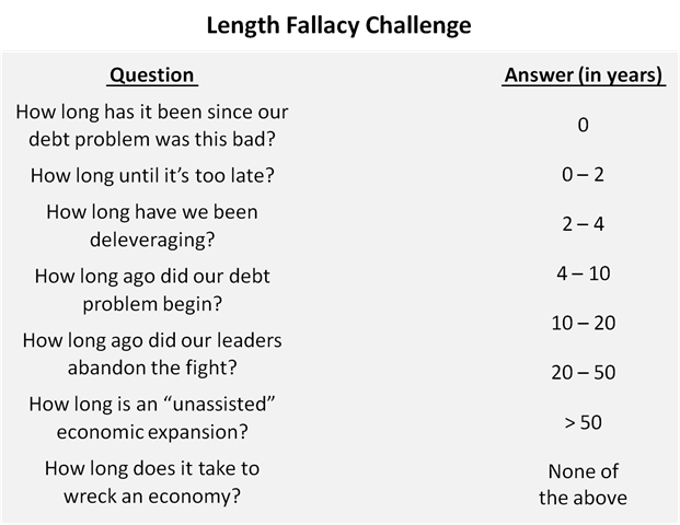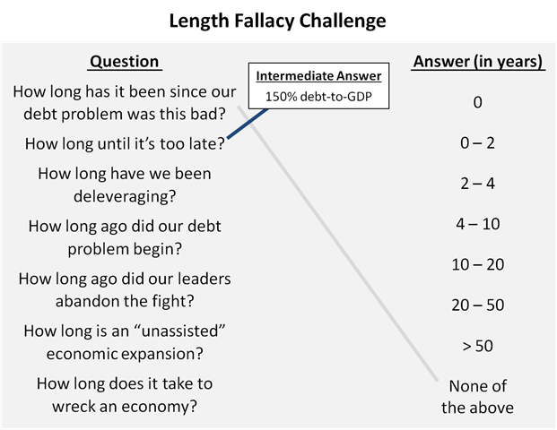Getting back to the length fallacy challenge, my conclusions only take me half way to an answer to the question: “How Long Until It’s Too Late?” In a later article in this series, I’ll complete the analysis and choose from the list of possible time frames. Between now and then, I’ll publish additional articles that’ll help me with that choice. And for now, I’ll record my intermediate answer: “Once our debt reaches 150% of GDP.”