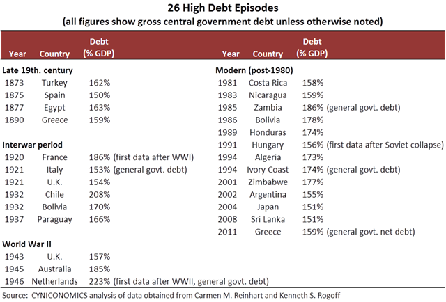Using mostly Reinhart and Rogoff’s database, I count 51 instances of debt crossing above 150% of GDP in the last few hundred years. But some of these were part of the same struggle with high debt,[1] or they lacked a full data set, or they lacked quality data and relevance because they happened in 18th or early 19th centuries.[2] By screening out each of these categories, I’ll narrow the analysis to 26 cases of debt-to-GDP ratios breaching 150%.