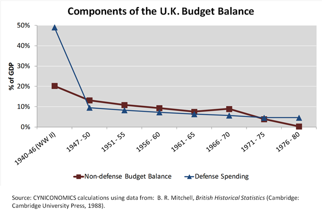 Step 1 – Revert to peacetime levels of defense spending. Eliminate the deficit by slashing defense spending to near or below the “non-defense budget balance” (which is simply the budget balance excluding defense spending as defined in my last article and shown below for the United Kingdom). This is the most important piece. Without aggressively cutting the deficit, you won’t make much of a dent in your debt ratios. And if you continue to run large deficits the ratios will worsen. Fortunately, it wasn’t difficult for most nations to achieve a budget surplus after World War II. Soldiers returned to civilian life and factories were released from military use. European nations were further assisted by the Marshall Plan. In the five years beginning in 1948, the United Kingdom, Netherlands and Australia ran fiscal surpluses of 5.5%, 9.5% and 1.5% 3.0% (correction) of GDP, respectively. By 1953, only the United Kingdom’s debt remained greater than its GDP. The British then continued to run surpluses for the next twenty years by taking advantage of a large non-defense budget balance, as shown in the chart below.