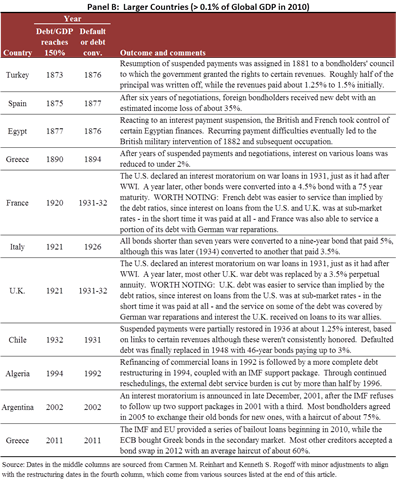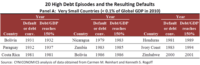 Now for the conclusion: In every one of the remaining 20 episodes of debt rising above 150% of GDP, the original terms of that debt weren’t honored. Investors either stopped receiving interest in an outright default or they were coerced into a debt conversion. The years of default or conversion are shown in the tables below, which separate the particularly small countries (those with a global GDP share of less than 0.1% in 2010) from the rest. For the small countries, the debt threshold is almost always breached after the beginning of the default or conversion process, with the only exception being two cases in which the default and threshold breach occurred in the same year.[3] In most of the larger countries, debt reached the 150% threshold before the default or conversion.